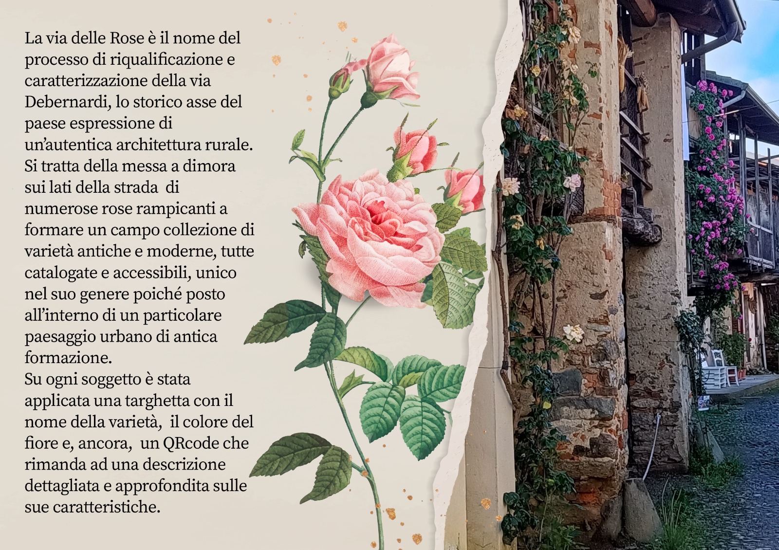 La via delle Rose è il nome del processo di riqualificazione e caratterizzazione della via Debernardi lo storico asse della frazione di Vermogno, comune di Zubiena (BI), espressione di un’autentica architettura rurale. Si tratta della messa a dimora sui lati della strada di 25 varietà di rose rampicanti a formare un campo collezione di varietà antiche e moderne, tutte catalogate e accessibili, unico nel suo genere poiché posto all’interno di un partcolare paesaggio urbano di antica formazione. Su ogni soggetto è stato applicata una targhetta con il nome della varietà, il colore del fiore e, ancora, verrà attribuito un QR code che rimanderà ad una descrizione dettagliata e approfondita delle sue caratteristiche. L’intervento è stato realizzato grazie al contributo della Fondazione Cassa di Risparmio di Biella attraverso il bando Armonia+.