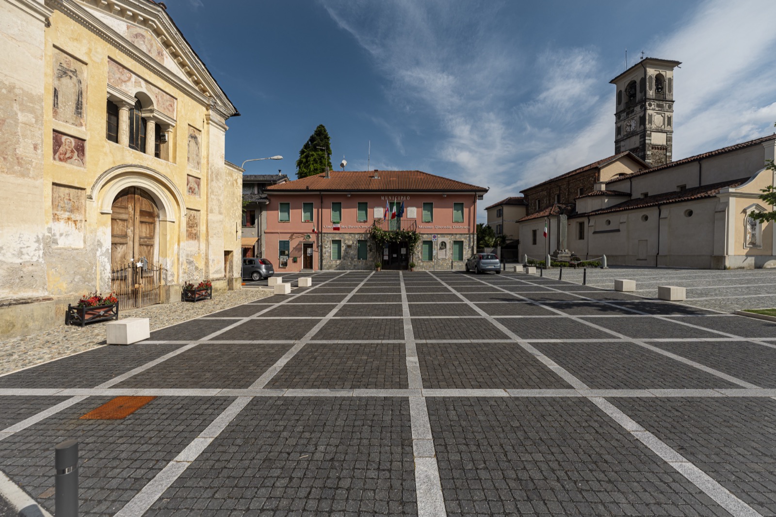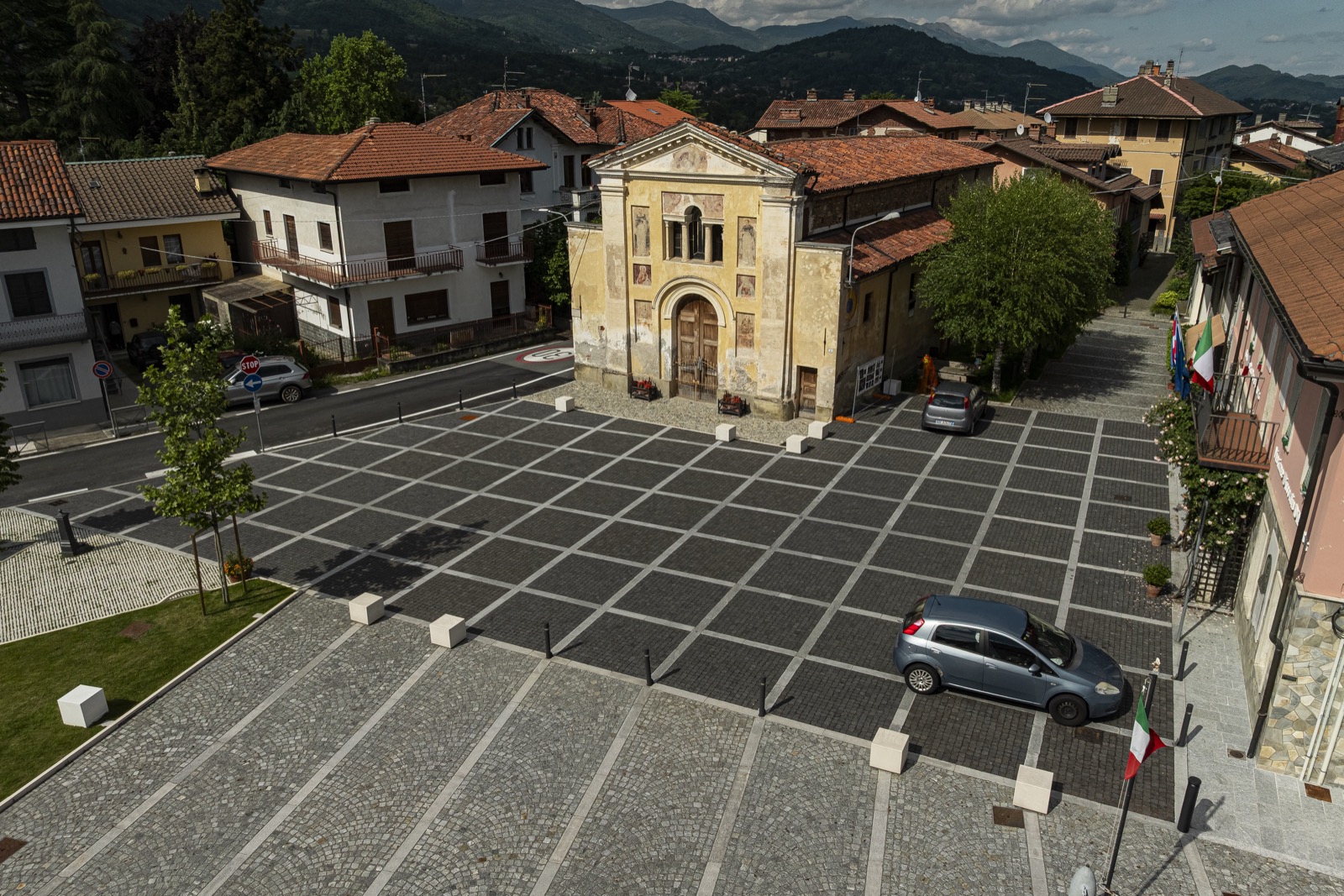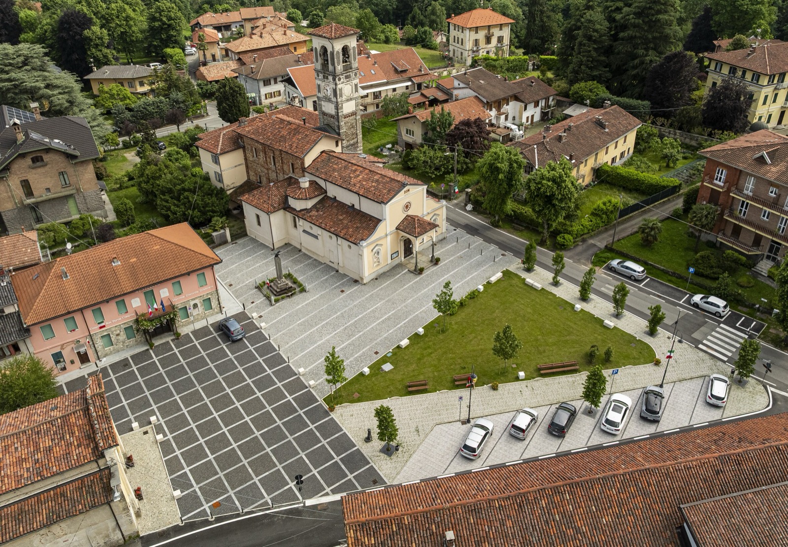 L’intervento ridisegna uno spazio “piazza” identificando le diverse funzioni che vi si affacciano, evidenziate con differenti pavimentazioni; un’area giardino con viali, tra le strade e la piazza, ripropone con nuova immagine la memoria storica del luogo. Su via Roma si è realizzata un’area a parcheggio con una pavimentazione in grigliato che all’interno forma un viale pedonale inerbito e alberato, perimetrale all’area a giardino, tra la Via Rivetti e la Chiesa della Confraternita. L’ampio sagrato della Chiesa di S. Eusebio, ripavimentato con cubetti di luserna e fasce in granito bianco, si estende fino al Municipio ove le fasce chiare formano un cassettonato con cubetti in basalto che differenzia visivamente la nuova funzione della piazza che affaccia sulla Via Roma. Di fronte alla Confraternita di S. Croce e S. Rosario; è ritagliato un piccolo sagrato in ciottoli preesistenti. La riqualificazione si completa con l’area verde a gioco e la pavimentazione della stradina in cubetti a lato della Chiesa. Un nuovo impianto d’illuminazione con segna passo nei cordoli e paletti luminosi, nottetempo ritagliano e differenziano discretamente gli spazi.