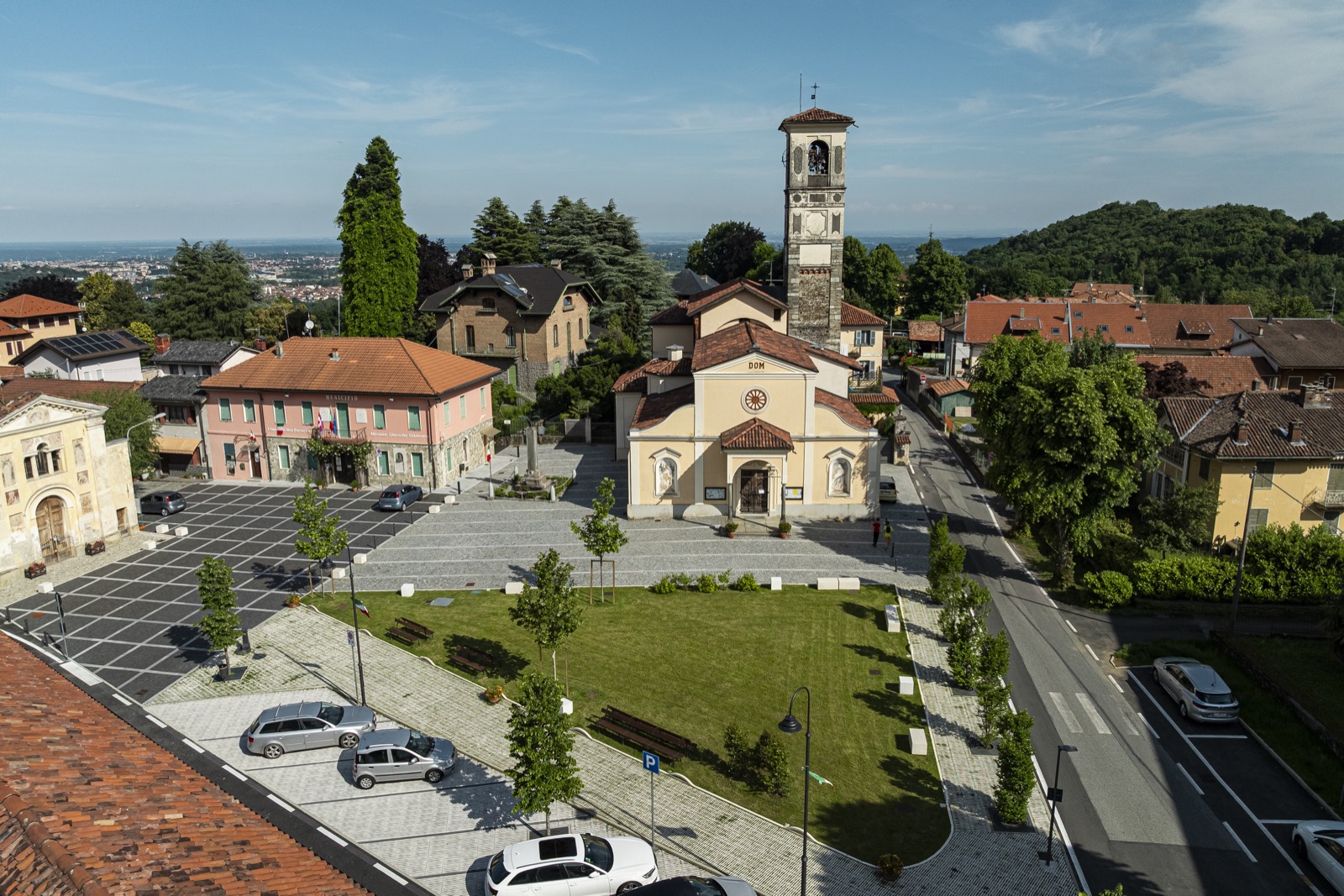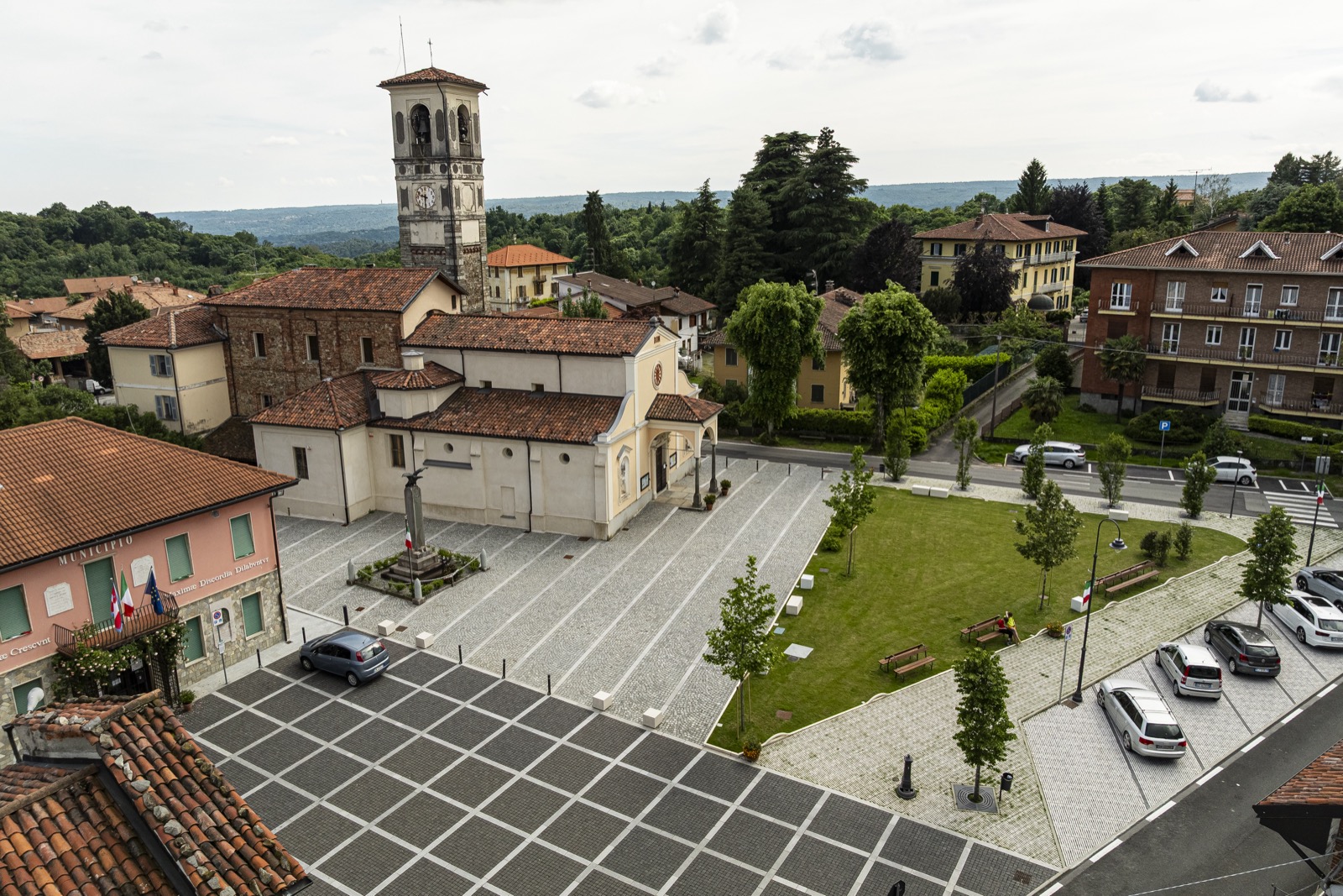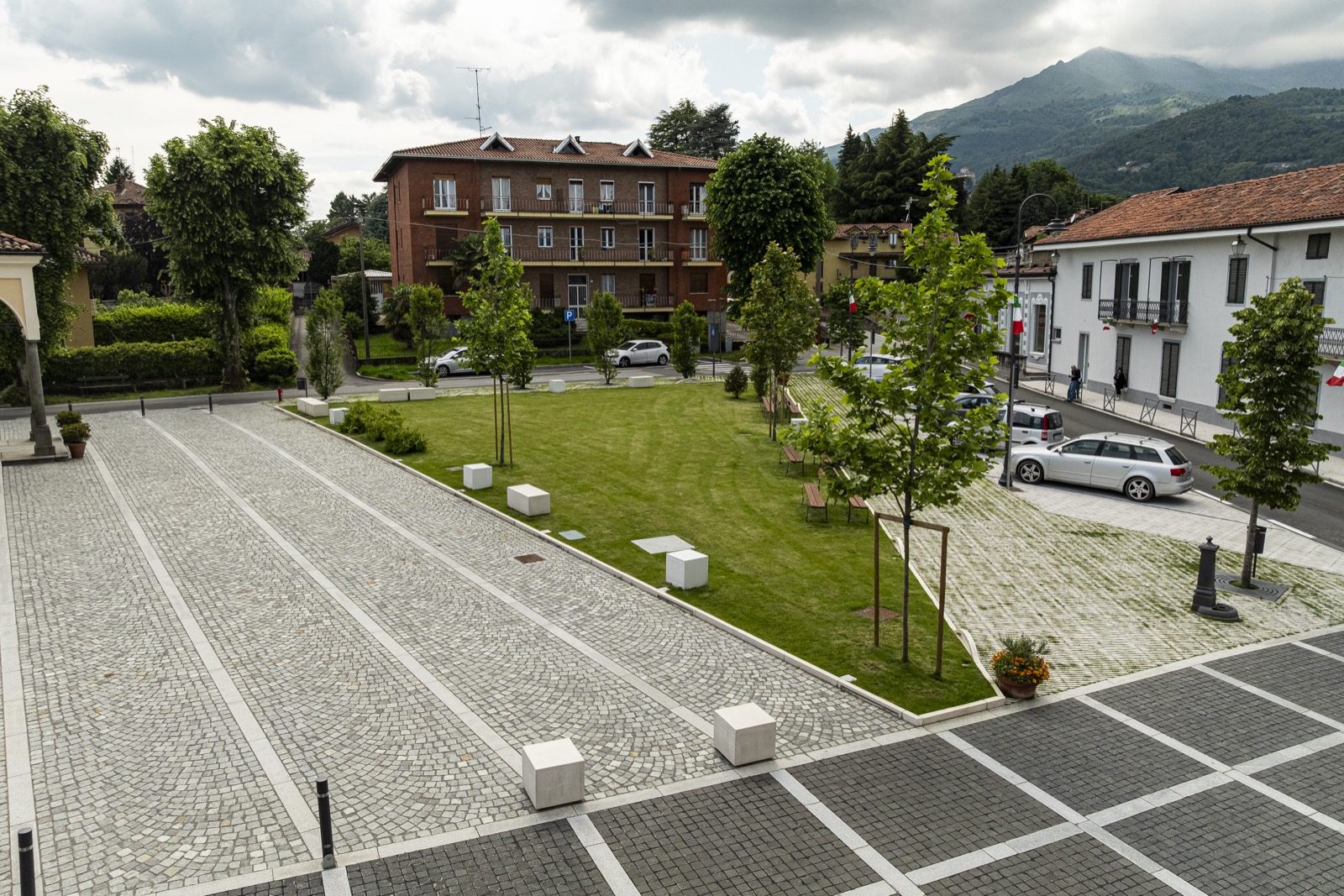 L’intervento ridisegna uno spazio “piazza” identificando le diverse funzioni che vi si affacciano, evidenziate con differenti pavimentazioni; un’area giardino con viali, tra le strade e la piazza, ripropone con nuova immagine la memoria storica del luogo. Su via Roma si è realizzata un’area a parcheggio con una pavimentazione in grigliato che all’interno forma un viale pedonale inerbito e alberato, perimetrale all’area a giardino, tra la Via Rivetti e la Chiesa della Confraternita. L’ampio sagrato della Chiesa di S. Eusebio, ripavimentato con cubetti di luserna e fasce in granito bianco, si estende fino al Municipio ove le fasce chiare formano un cassettonato con cubetti in basalto che differenzia visivamente la nuova funzione della piazza che affaccia sulla Via Roma. Di fronte alla Confraternita di S. Croce e S. Rosario; è ritagliato un piccolo sagrato in ciottoli preesistenti. La riqualificazione si completa con l’area verde a gioco e la pavimentazione della stradina in cubetti a lato della Chiesa. Un nuovo impianto d’illuminazione con segna passo nei cordoli e paletti luminosi, nottetempo ritagliano e differenziano discretamente gli spazi.